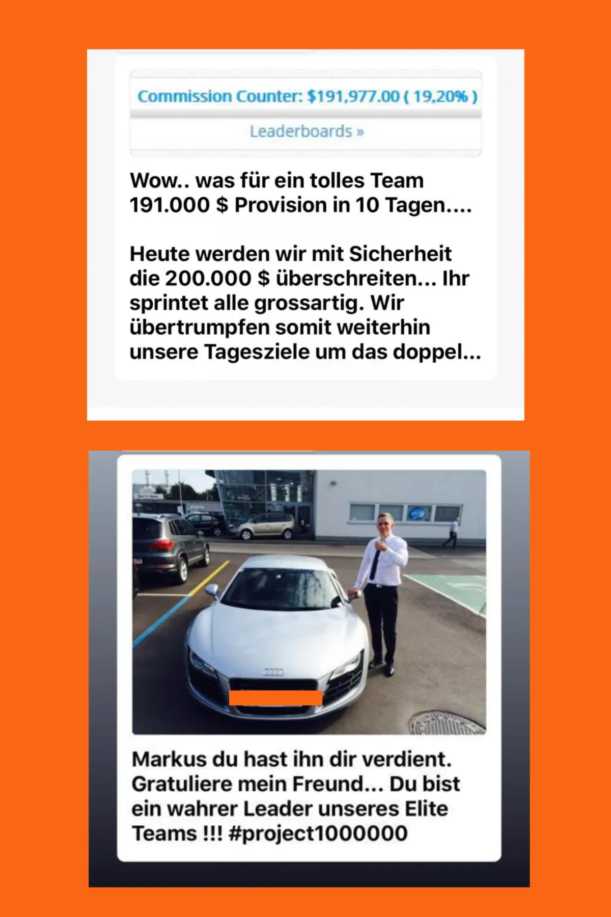 Es gab eine Live-Webseite. Einen Counter, der in Echtzeit zählte. Jede Provision, die jemand aus dem Team verdiente, wurde sofort sichtbar aufaddiert. Jeder Partner konnte jederzeit nachschauen: Wie weit sind wir? Schaffen wir es, bevor die Zeit abläuft?